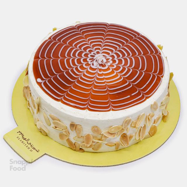 کیک نسکافه ای با رویه ی ژله ی کاراملی و تزیین پرک بادام بوداده